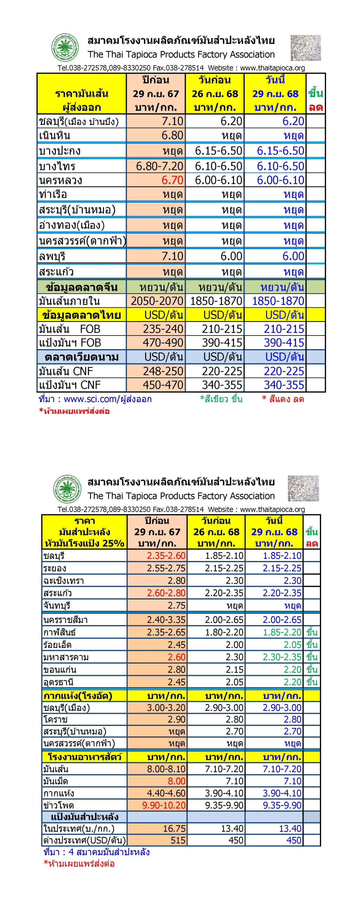 ราคามันสำปะหลัง วันที่ 29 กันยายน 2568