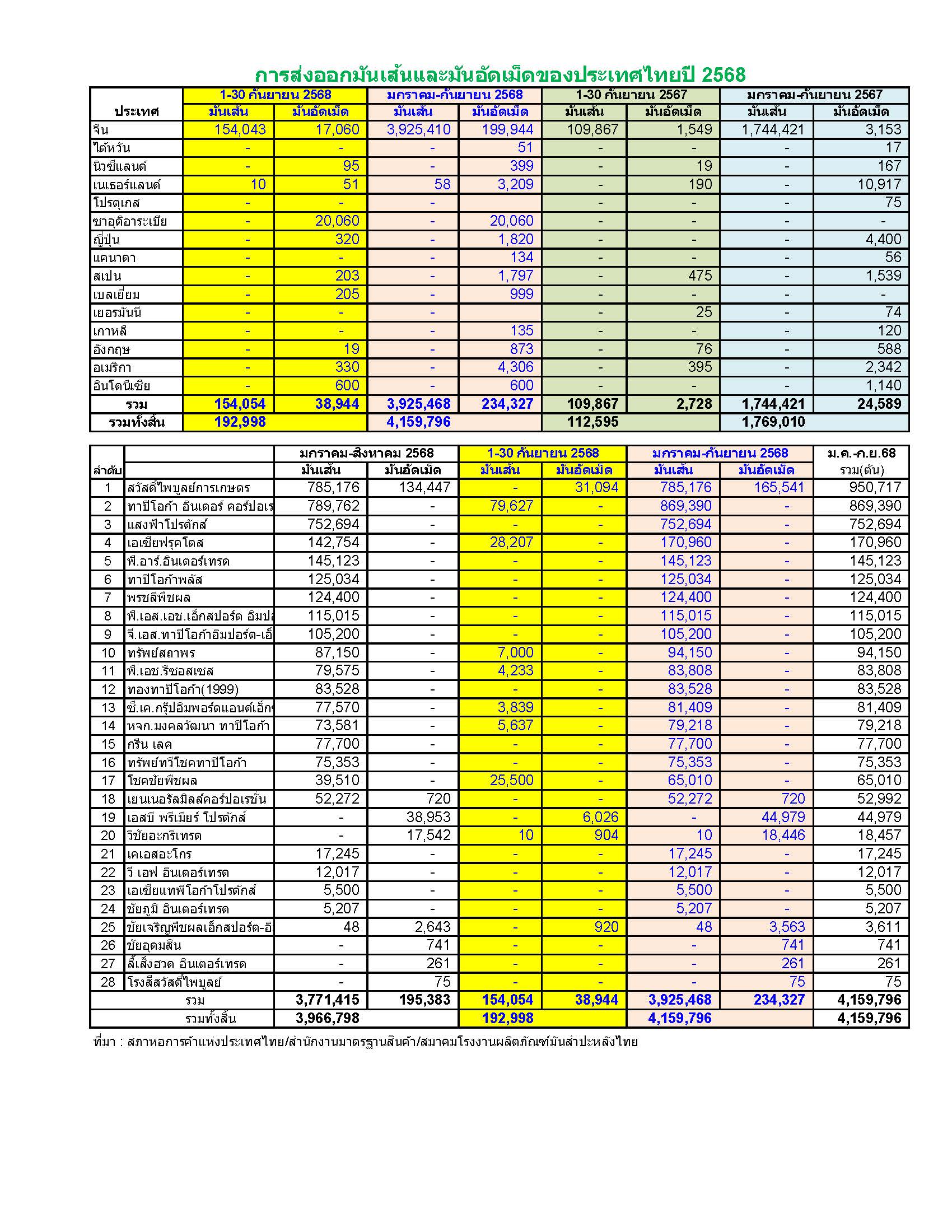 ส่งออกมันเส้นมันเม็ดเดือนกันยายน 2568
