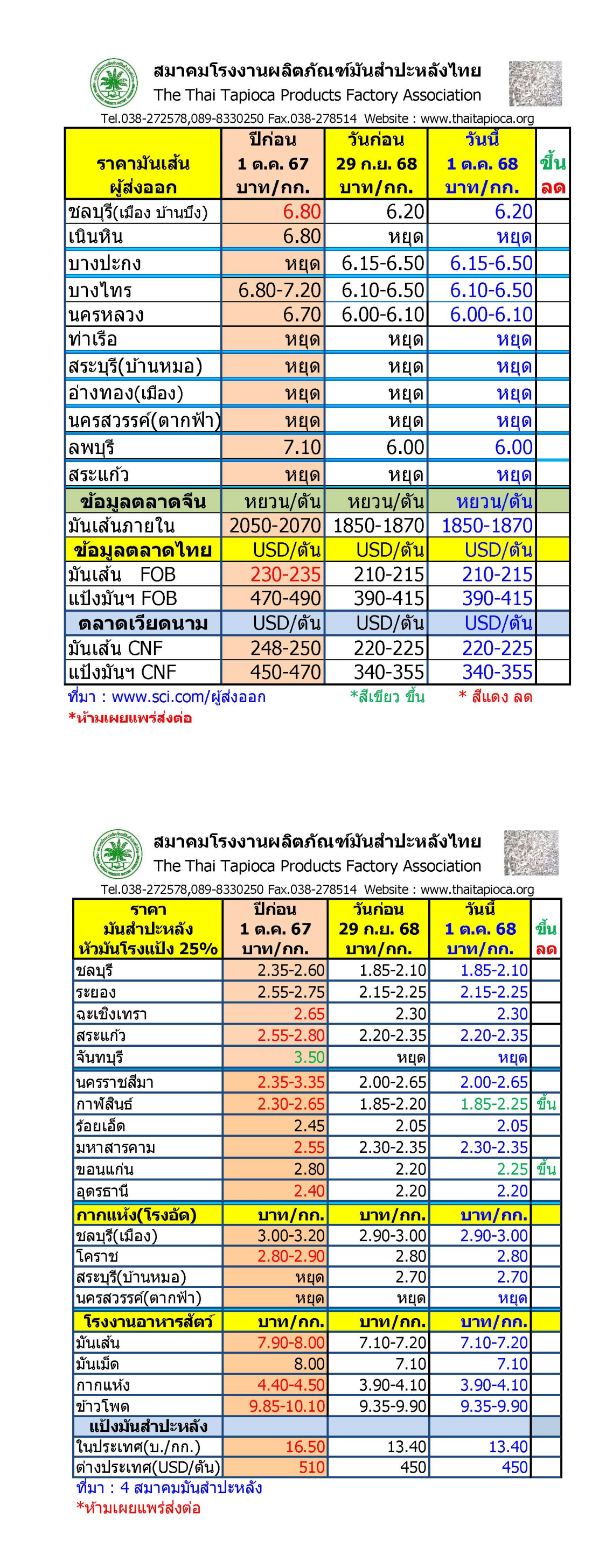 ราคามันสำปะหลัง วันที่ 1 ตุลาคม 2568