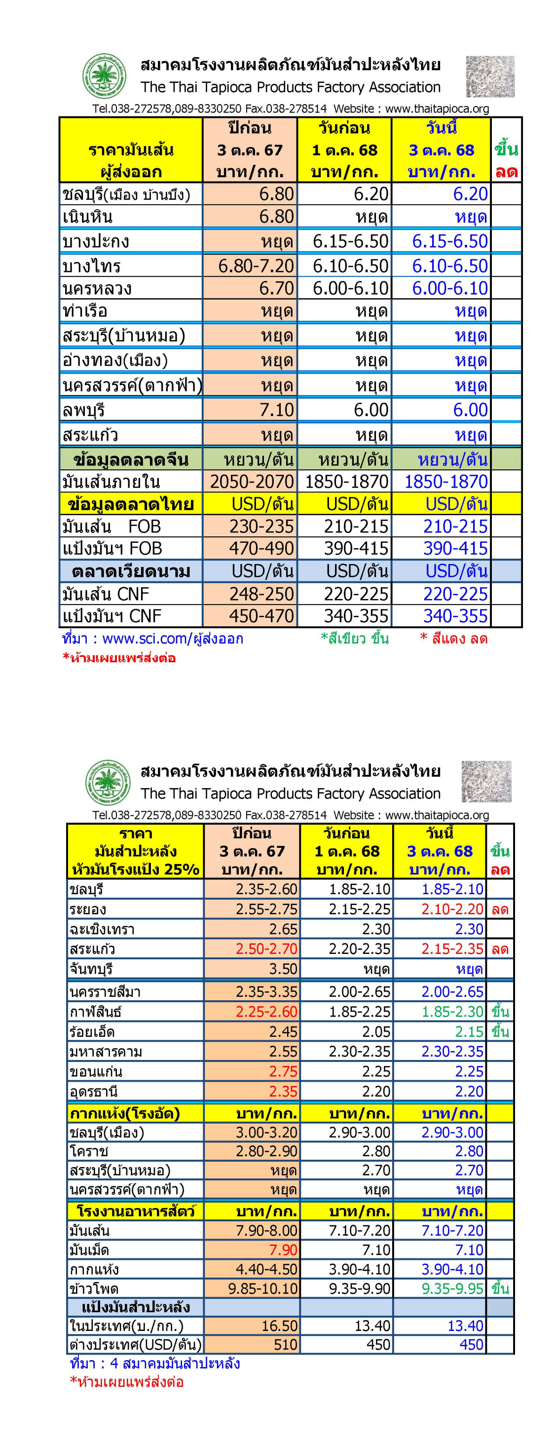 ราคามันสำปะหลัง วันที่ 3 ตุลาคม 2568
