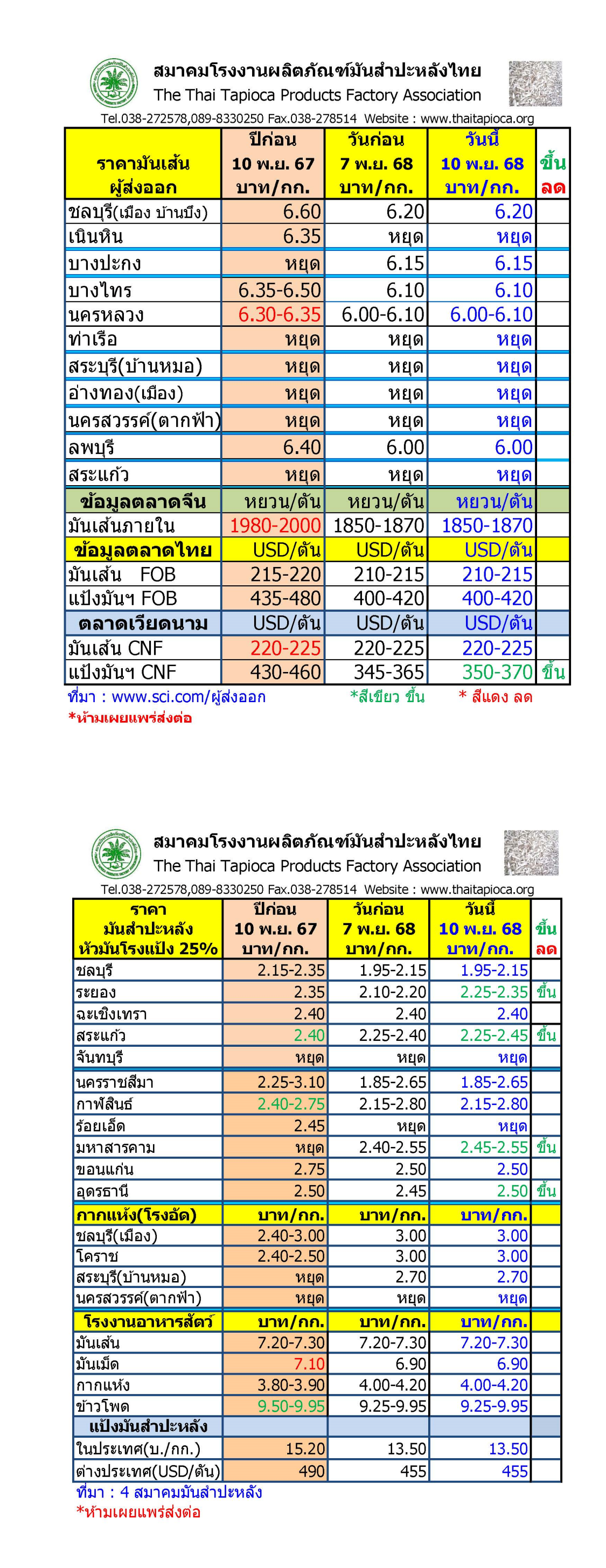 ราคามันสำปะหลัง วันที่ 10 พฤศจิกายน 2568