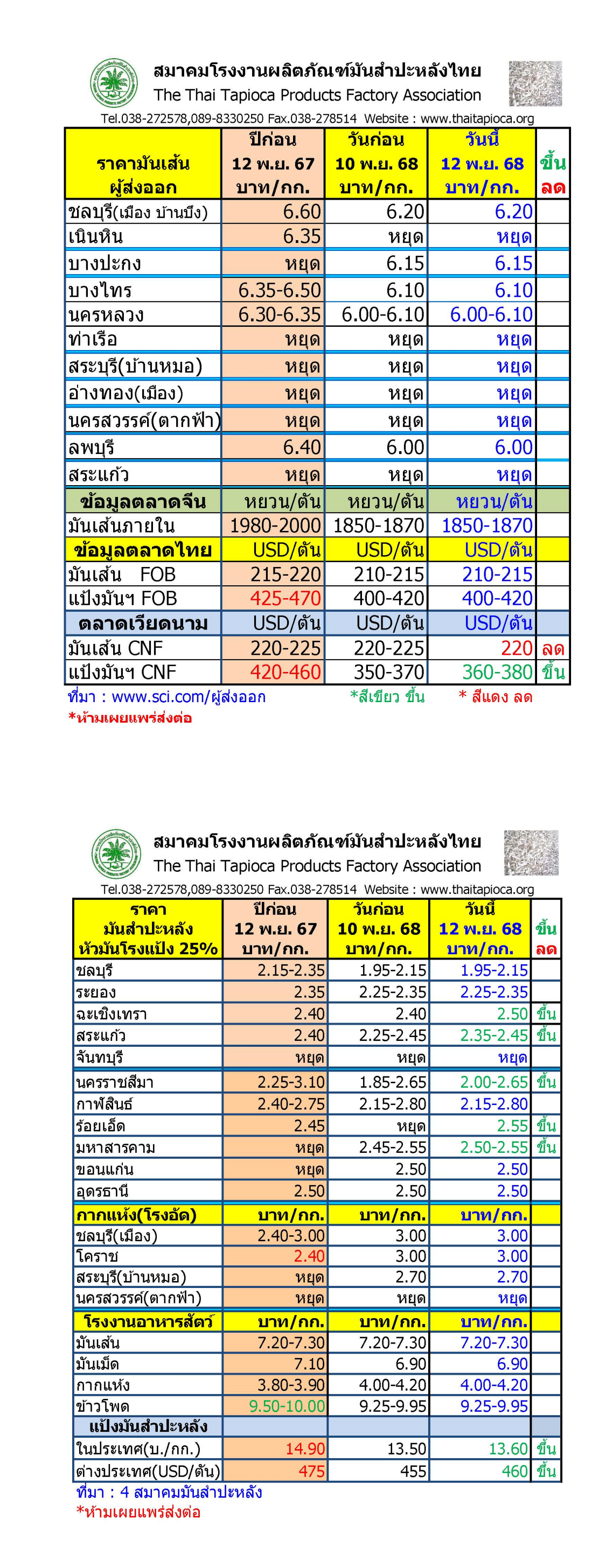 ราคามันสำปะหลัง วันที่ 12 พฤศจิกายน 2568