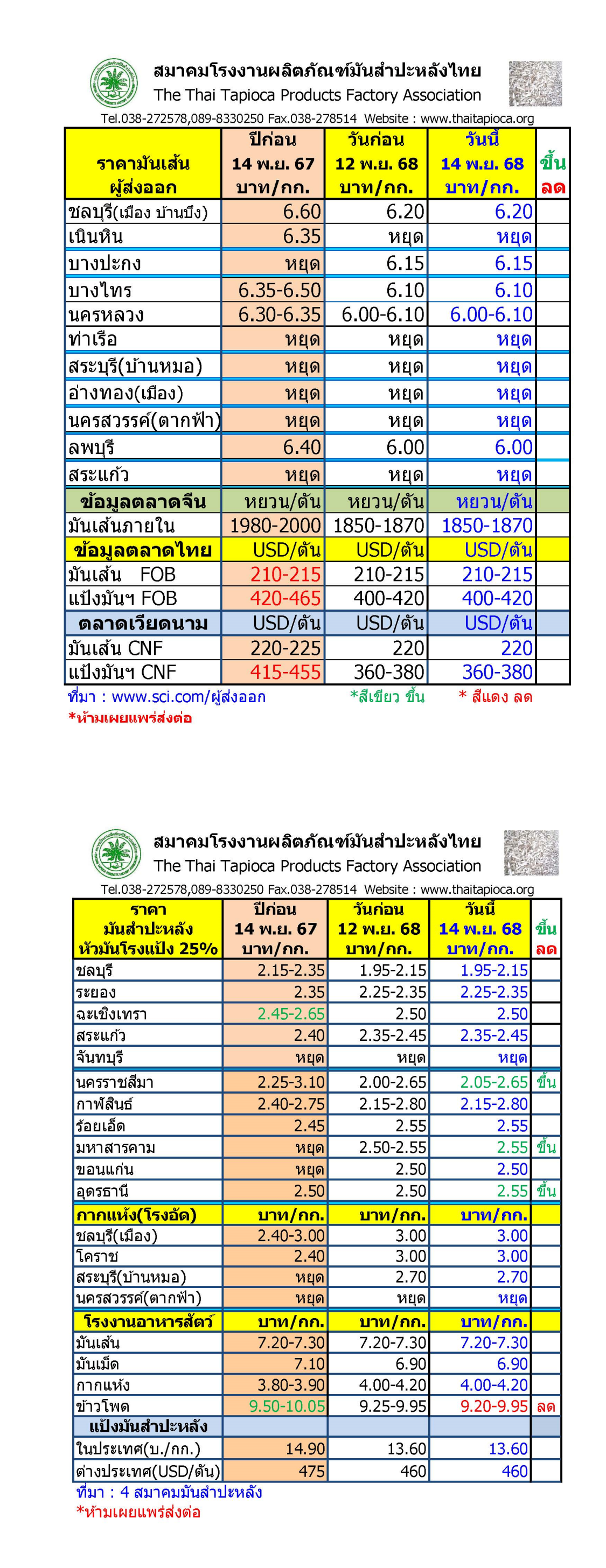 ราคามันสำปะหลัง วันที่ 14 พฤศจิกายน 2568