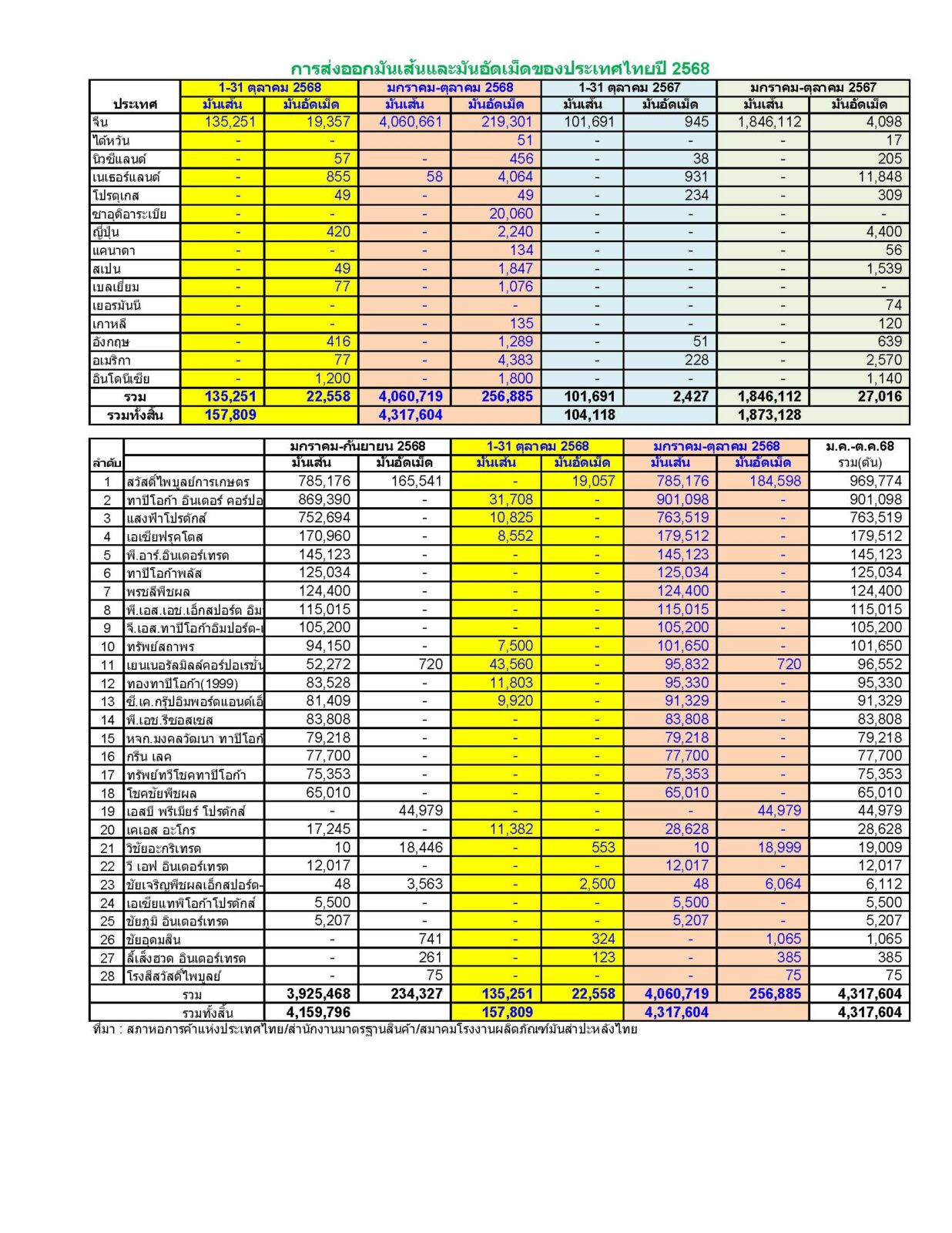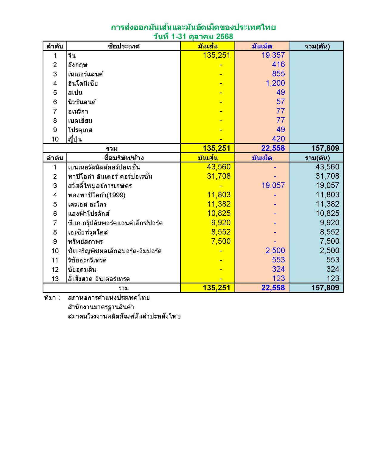 ส่งออกผลิตภัณฑ์มันสำปะหลังส่งออกมันเส้นมันเม็ดเดือนตุลาคม 2568 Posted on 7 พฤศจิกายน 20257 พฤศจิกายน 2025 by Tapioca-Chonburi 07 พ.ย. FacebookFacebookXXLINELine